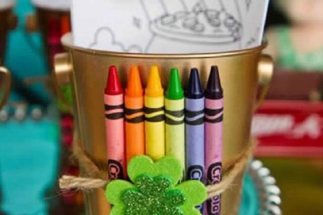 Outra opção são os baldes com itens para colorir. Na parte da frente, é possível colocar alguns lápis de cor ou giz de cera. Dentro, faça uma seleção de desenhos – de preferência dos personagens favoritos da criança – e estimule a criatividade. Confira a sugestão a seguir.