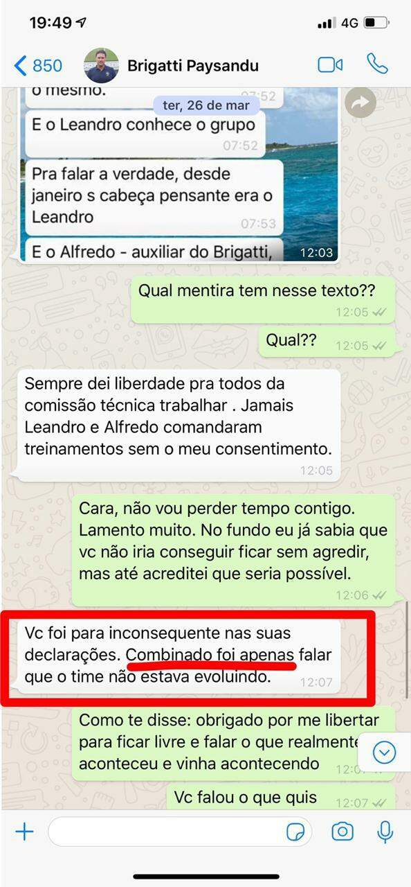 Presidente do Paysandu revela acordo com Brigatti, mostra prints e dispara: "É um cretino!" Ricardo Gluck Paul detalhou a polêmica demissão do técnico João Brigatti Carlos Fellip 28.04.19 21h10 João Brigatti (e) e Ricardo Gluck Paul (c) protagonizam polêmica (Jorge Luís / Paysandu) A polêmica saída do técnico João Brigatti do Paysandu ganhou um novo capítulo. Depois de confirmar publicamente que o motivo da demissão do técnico, o presidente bicolor, Ricardo Gluck Paul, foi insultado por Brigatti e resolveu responder esclarecendo mais detalhes da convivência conturbada do treinador na Curuzu. O CASO O motivo apontado para a demissão foi que Brigatti - conforme explicado pelo mandatário do Papão ao GloboEsporte - pediu para que o médico do clube, José Silvério, fraudasse um exame do zagueiro Micael. Isto ocorreu na semana do primeiro Re-Pa do ano, quando o Micael havia sentido um problema no dedo do pé. Brigatti, no entanto, queria tirar o atleta e capitão do time titular. O laudo falso apontaria uma lesão maior que vetaria a participação de Micael no clássico. LEIA MAIS João Brigatti não é mais treinador do Paysandu Braço direito de Brigatti anuncia que está de saída O caso foi denunciado a Gluck Paul, que, em reunião com a diretoria, resolveu aguardar para não tumultuar o ambiente naquela semana de clássico. O jogo foi vencido pelo Papão em uma clara amostragem de desequilíbrio emocional do Remo, que ficou com dois jogadores expulsos. Apesar da vitória, o clima na Curuzu ficou cada vez mais pesado e o "segredo" administrativo chegou aos ouvidos dos jogadores. Foi quando, na semanda do segundo Re-Pa, após o empate em 1 a 1 com o Castanhal em Belém, o presidente tomou a decisão de demitir Brigatti, que, diante das denúncias de fraude, propôs um acordo. Último jogo do Paysandu comandado por João Brigatti foi na Curuzu (Oswaldo Forte / O Liberal) PALAVRA DE GLUCK PAUL "Brigatti é um cretino! Fui perguntado por dois atletas se a questão do exame do Micael era verdade e vi que a situação estava mesmo insustentável. Comuniquei o Felipe (Albuquerque, executivo de futebol) que ia demitir o Brigatti. Todos do Departamento Médico e pessoas da própria Comissão Técnica já me cobravam essa atitude. Foi quando chamei o Brigatti para uma conversa na sede social. Mostrei os prints que comprovavam os pedidos dele para que o Silvério (médico do Paysandu) fraudasse o laudo do Micael e ele ficou branco. Ele ficou branco! Aceitou a demissão, mas pediu para que eu não tocasse no assunto. Naquele momento, ele pediu para falar que foi apenas uma questão de desempenho. Eu aceitei para não tumultuar ainda mais o clube internamente", disse. O problema foi que, ao deixar o Paysandu, Brigatti atacou a diretoria do clube. "Ele deu uma entrevista no hotel dizendo que eu não entendia nada de futebol e que a demissão dele era um reflexo do futebol brasileiro... Um jornalista daqui soltou a história do laudo e depois fui chamado a uma entrevista para falar de balanço da temporada e, no meio da conversa, acabou indo para o lado do que ocorreu na saída do Brigatti. Eu tenho a consciência tranquila. Aconteceu mesmo! Eu falei o que houve de fato e depois o Brigatti veio me cobrar que eu tinha 'quebrado o acordo'. Agora, me responde como ele diz por aí que a história do laudo é falsa? Como ele quer se fazer de surpreso? É um mentiroso!", disparou Gluck Paul. Perguntado se há a possibilidade de levar o caso à Justiça, o presidente do Paysandu ponderou: "Acho que não cabe. Acho que ele, que diz que estou mentindo, é quem deveria se sentir no direito de me processar por calúnia ou algo parecido, não? Por que não faz? Porque sabe que tudo o que falei é verdade. Ele é um mentiroso e debochado". MAIS DENÚNCIAS "Depois do que ocorreu com o Micael, outras histórias começaram a surgir. Os médicos me contaram que Brigatti ficava nos treinamentos diminuindo os jogadores. Ele dizia: 'O que eu faço com um goleiro que não enxerga no escuro? Como treino um zagueiro com duas pernas esquerdas?'. Esta era uma postura que todos reprovavam, porque foi o Brigatti que participou da escolha dos atletas. Ele estava traindo os caras que acreditaram nele para vir para o Paysandu", disse. Outra insatisfação revelada foi em relação à desistência do técnico em relação a determinados atletas. "Ele não conseguia fazer um atleta jogar como ele achava que tinha que jogar. Várias vezes, desistiu de jogadores. Foi o caso do Willyam, do Alan Calbergue, do Jhonny Douglas... Brigatti perdeu o elenco desta forma". Gluck Paul ainda foi além e, para comprovar a insatisfação do elenco com o técnico, revelou: "Vencemos um jogo por 3 a 0 sobre o São Francisco em Santarém. Achamos dois gols de bola parada no final do jogo e o vestiário foi um velório, porque todos sabiam que o time tinha ganhado aquela vitória no colo. Não se via evolução mesmo! Recebi cobranças da comissão técnica e até de jogadores em relação aos treinos, porque o Brigatti não dava mais treinos." Brigatti recebeu o elenco 2019 do Paysandu em treino aberto na Curuzu (Jorge Luiz / Paysandu) ÁUDIO Um áudio de João Brigatti negando as acusações do Paysandu viralizou e Ricardo Gluck Paul foi taxativo: "Sobre o áudio do Brigatti só tenho a dizer que está repleto de mentiras. Ele é um cretino. Estão todas as informações distorcidas, todas. Jamais ele foi pressionado a escalar ou deixar de escalar jogador. A reunião que ele disse que fez comigo pós jogo contra o São Francisco para analisar desempenho é mentira, ele foi chamado para dar explicações do caso sim." Em relação aos argumentos de Brigatti de que o mesmo não teria participado das escolhas de jogadores para o elenco de 2018, o mandatárioo alviceleste é categórico: "Mentiroso! Estava, inclusive, no Comitê de futebol, que montamos para a montagem do elenco. Ele participou indicando e avaliando atletas". RELACIONA