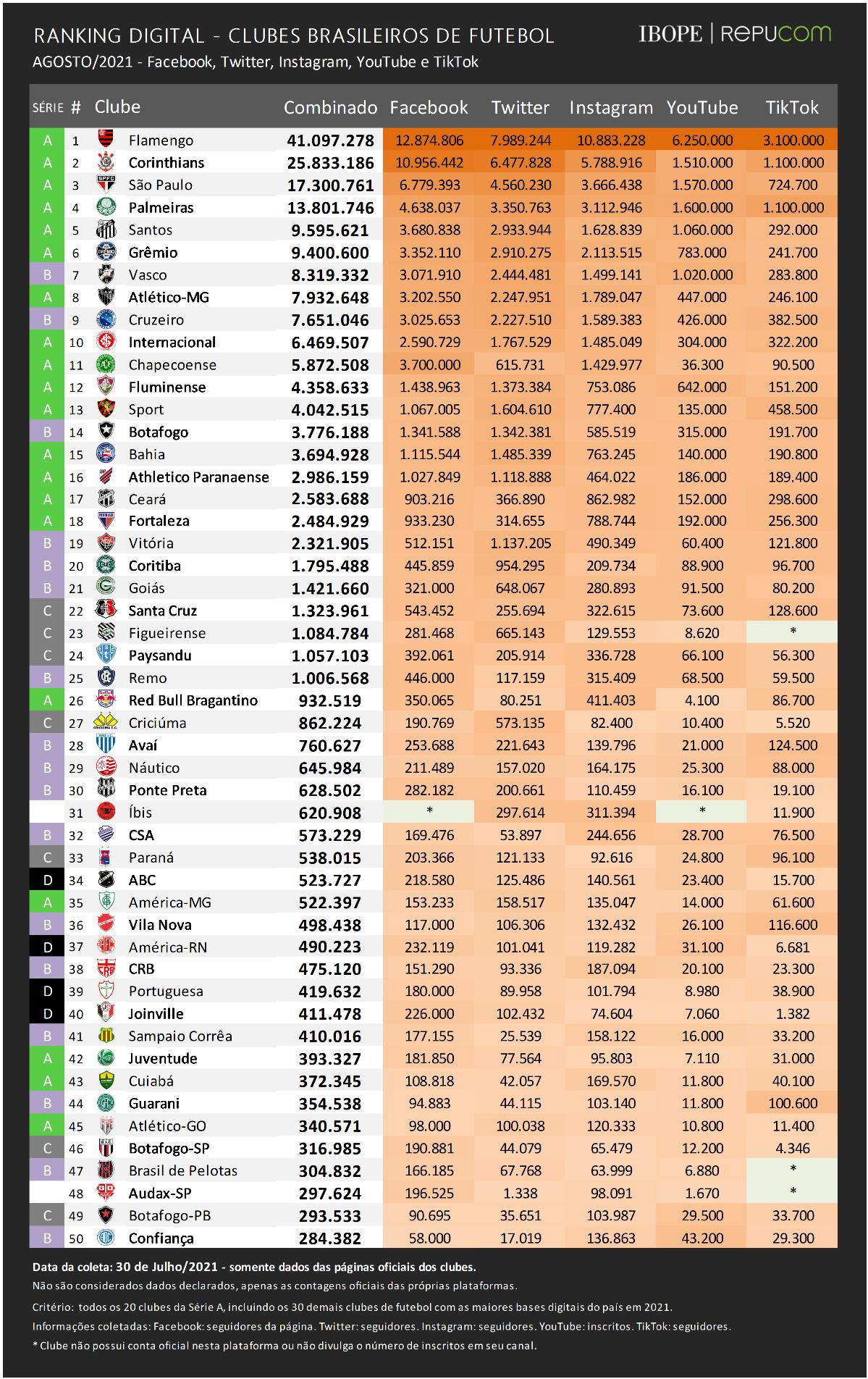 Remo alcança 1 milhão de seguidores nas redes sociais, mas segue abaixo do Paysandu no ranking Leão azul ocupa a 25ª posição no ranking dos clubes nas redes sociais O Liberal 06.08.21 9h18 Dirigentes aguardam a liberação de pelo menos 80% das cidades envolvidas no campeonato (Lívia Alencar / Remo) A pandemia deixou os estádios sem torcida, sem publico, os torcedores cada vez mais estão ligados nas redes sociais dos clubes. No final do mês de julho, segundo dados do IBOPE Repucom, o Remo bateu a marca de 1 milhão de inscritos nas redes sociais, porém, o clube azulino ainda fica atrás do Paysandu, seu maior rival, mas a diferença está cada vez menor. O Remo foi um dos destaques do mês de julho. O Remo ocupa a 25ª posição no ranking das redes sociais com 1.006.568 seguidores juntando Facebook, Twitter, Instagram, Youtube e TikTok. O Paysandu está uma posição acima, com 1.057.103, uma diferença de um pouco mais de 50 mil a favor do clube bicolor, que tinha atingido a marca no mês de abril. Pelo lado azulino, a torcida é mais forte no Facebook, YouTube e também no TikTok. O Leão foi destaque no TikTok, onde desenvolveu proporcionalmente a sua base no último mês, obtendo um avanço de 26%, de acordo com o IBOPE Repucom. Já do lado bicolor, o Papão é mais forte no Twitter e no Instagram. Na cola de Leão e Papão está o Red Bull Bragantino-SP, na 26ª posição com 932 mil seguidores. Veja o ranking completo O líder do ranking é o Flamengo-RJ com mais de 41 milhões de seguidores, Corinthians com 25, São Paulo com 17, Palmeiras com 13 e Santos com 9 milhões fecham o top5. Todos os clubes das Séries A, B, C e D fazem parte da pesquisa, além do Íbis-PE, clube que possui mais de 600 mil seguidores apenas no Twitter, Instagram e TikTok. Assine O Liberal e confira mais conteúdos e colunistas. 🗞 Entre no nosso grupo de notícias no WhatsApp e Telegram 📱 Palavras-chave esportes remo futebol jornal amazônia paysandu redes sociais remo remo futebol futebol jornal amazônia jornal amazônia COMPARTILHE ESSA NOTÍCIA Remo . Desculpe pela interrupção. Detectamos que você possui um bloqueador de anúncios ativo! Oferecemos notícia e informação de graça, mas produzir conteúdo de qualidade não é. Os anúncios são uma forma de garantir a receita do portal e o pagamento dos profissionais envolvidos. Por favor, desative ou remova o bloqueador de anúncios do seu navegador para continuar sua navegação sem interrupções. Obrigado! ÚLTIMAS EM REMO CHEGOU! Remo anuncia Léo Condé como novo treinador O nome de Condé ganhou força nos bastidores após uma reviravolta nas tratativas conduzidas pela diretoria remista 04.03.26 22h11 DECISÃO Flávio Garcia inicia preparação do Remo e diz ter 'alguma ideia' para a final do Parazão Flávio Garcia também destacou a postura do elenco nos primeiros dias de preparação para a decisão 04.03.26 19h19 MOTIVADO João Lucas nega falta de empenho do Remo no Parazão: 'A gente veio aqui pra ser campeão' Lateral-direito diz que o grupo trabalha para corrigir erros e buscar a virada no jogo de volta da final do Parazão 04.03.26 19h07 Futebol Destaque do Remo, Alef Manga é o jogador com a maior nota de fevereiro, aponta site Jogador azulino somou a melhor média em cinco jogos no mês 04.03.26 12h47 MAIS LIDAS EM ESPORTES JOGOS DE HOJE Futebol: veja quem joga hoje, quarta-feira (04/03), horários das partidas e onde assistir ao vivo Copa do Brasil, Bundesliga, Copa Sulamericana e outras competições internacionais movimentam o futebol nesta quarta-feira 04.03.26 7h00 RENDIMENTO Se o jogo acabasse no intervalo, o Remo estaria no G4 do Brasileirão Queda de rendimento no segundo tempo tem custado pontos ao Leão, que faz bons 45 minutos iniciais, mas perde força após a volta do vestiário 04.03.26 8h00 FALOU O ÍDOLO Agnaldo critica postura do Remo no Parazão e cobra atitude antes do jogo decisivo: 'Tem que honrar' O contraste com o Brasileirão, na visão do ídolo, é evidente 03.03.26 20h28 futebol Janela internacional fecha, mas clubes brasileiros ganham período extra para contratações; entenda CBF abriu um período extra para movimentações entre as equipes brasileiras 04.03.26 11h47